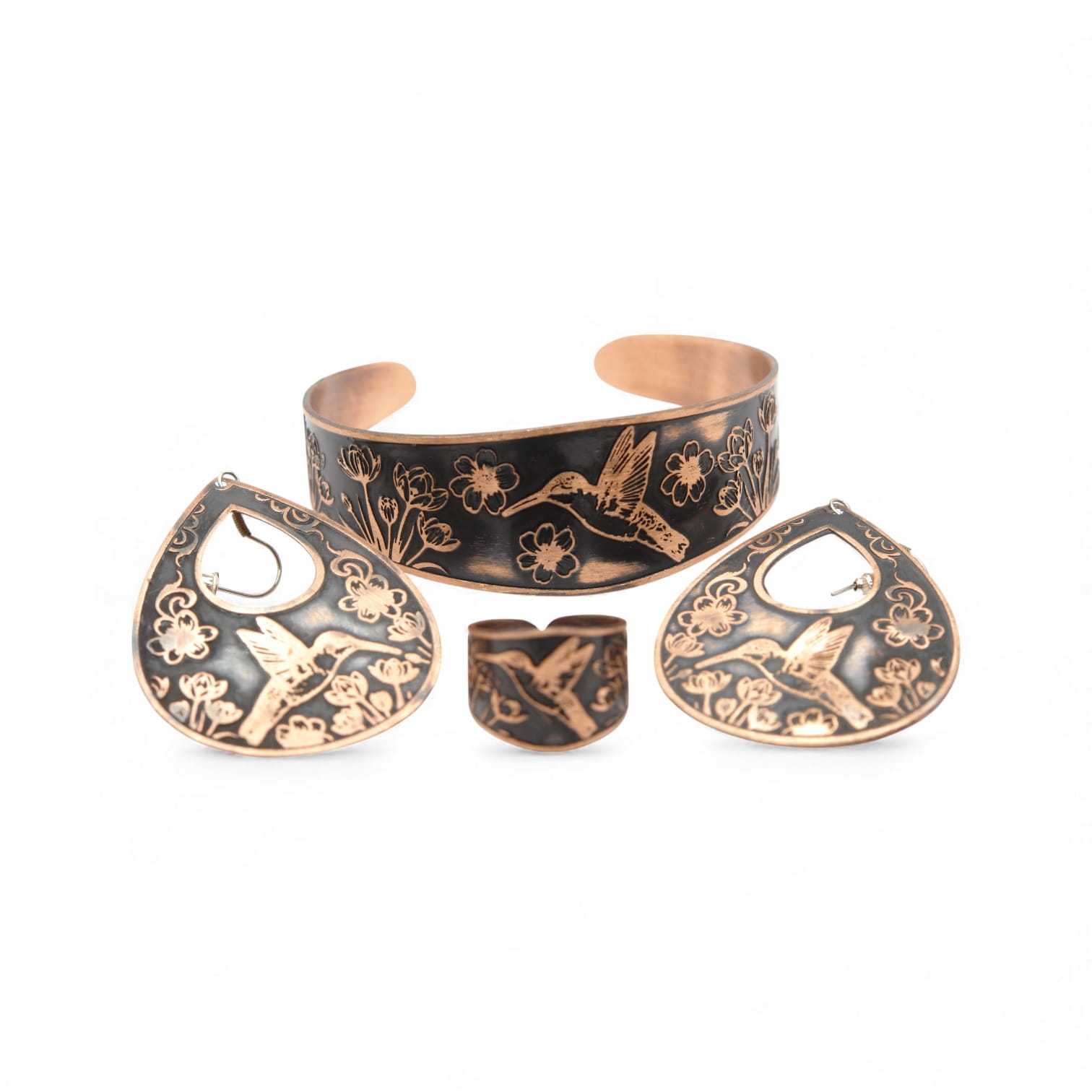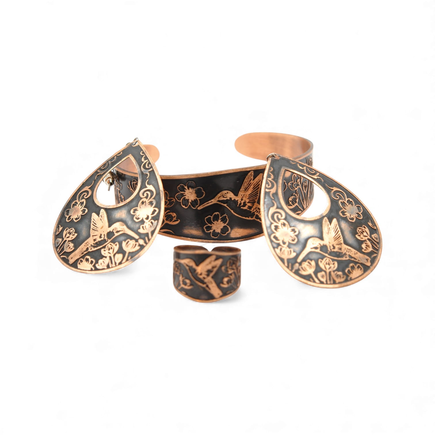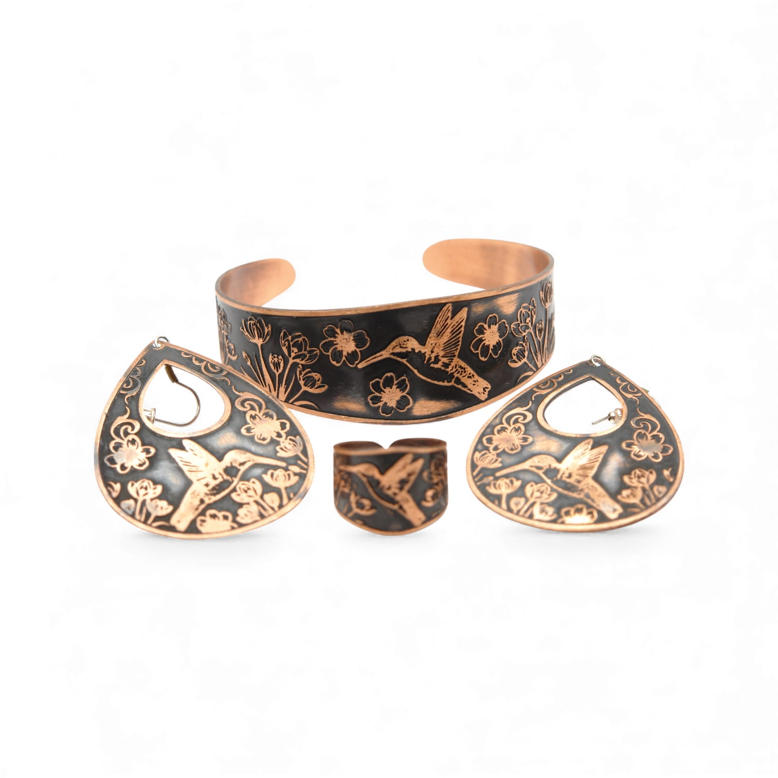 Zestaw biżuterii „Koliber” — damski komplet: bransoletka, pierścionek i kolczyki z miedzi 99,9 %. Lekki, elegancki i subtelny dodatek do codziennych i wieczorowych stylizacji.